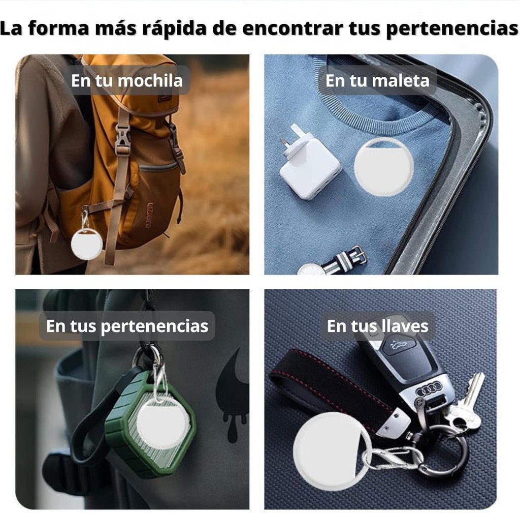 ✅【Diseño Práctico y Versátil】🧳🔑 – Lleva tus rastreadores donde quieras: incluye púa para cambiar la batería y un pequeño agujero para que puedas fijarlos fácilmente a llaves, mochilas, equipaje o incluso collares/arneses de mascotas.